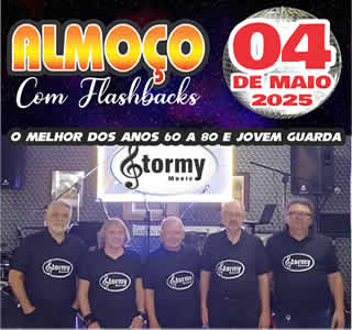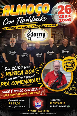 A Banda Stormy Music estará realizando dia 04 de maio um almoço musical a partir das 12horas no Restaurante Ed Carnes (de propriedade do "Príncipe da Jovem guarda Ed Carlos), neste dia vamos relembrar sucessos dos anos 60 a 80 nac/inter e Jovem guarda. Venham se divertir saboreando um delicioso almoço com amigos e familiares. reservas antecipadas 35,00 nos Pix: 11 9.6576-1925 e 11 9.3484-3636 ou 40,00 no dia do show. Ed Carnes, Rua Teodureto Souto, 292 - Cambuci - SP. Tel 11 3309-02-12 ou 11 9 8524-4417 - Aguardamos sua valiosa presença!
