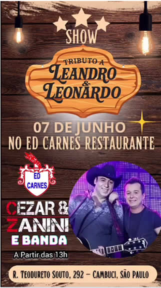 Estaremos fazendo um belíssimo show com a dupla Cesar e Zanini, com as inesquecíveis músicas de Leandro e Leonardo: um Tributo à dupla. Venham nos prestigiar.
